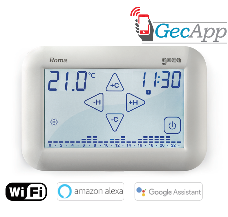 Alimentato a 230Vac-50Hz, consente di avere sempre e in tempo reale le informazioni aggiornate sull'impianto di riscaldamento o condizionamento e di variarne lo stato e le impostazioni in modo semplice ed intuitivo. L'APP, che è in grado di gestire più cronotermostati contemporaneamente dallo stesso smartphone, consente di accendere e spegnere l'impianto, programmare il funzionamento settimanale, commutare in modalità manuale, impostare la funzione antigelo e attivare, in caso di necessità, gli allarmi di superamento delle temperature impostate.