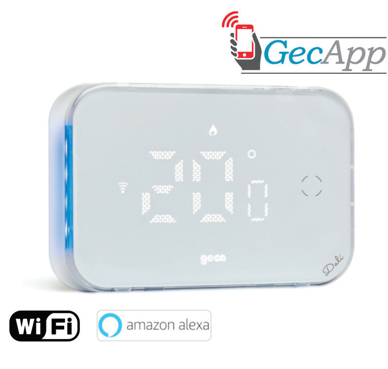 Dalì è il nuovo cronotermostato settimanale intelligente di GECA dal design moderno e minimale che può essere interrogato e programmato tramite una semplicissima APP gratuita. Può essere installato su scatola da incasso a 2 o 3 moduli o a parete. Alimentato a 230V, consente di avere sempre informazioni aggiornate sull’impianto di riscaldamento o condizionamento e di variarne lo stato e le impostazioni in modo semplice ed intuitivo. La banda a led laterale (regolabile nella luminosità o escludibile) indica, cambiando colore, lo scostamento dalla temperatura impostata.