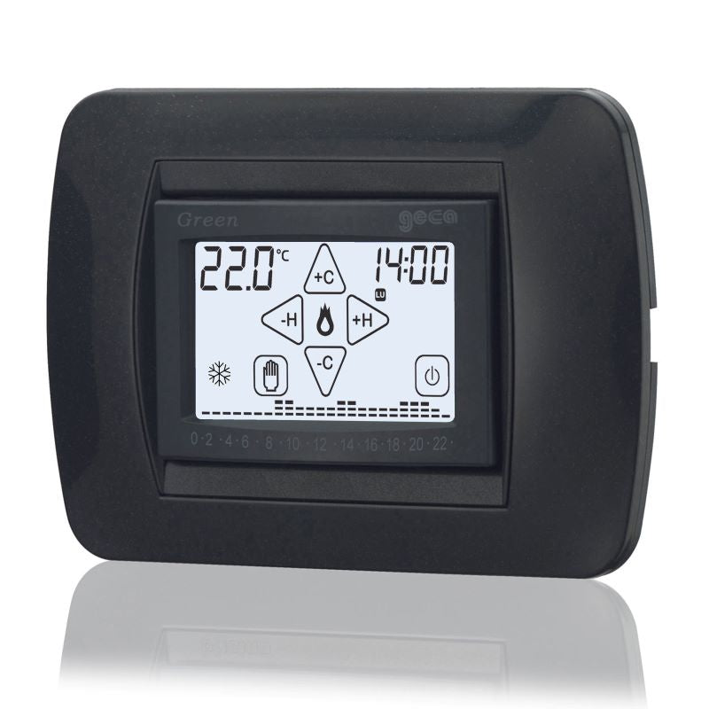 Cronotermostato digitale touch screen con display retroilluminato. Facilissimo da installare in scatola 3 moduli, è intercambiabile con i termostati DAY e T-TOUCH ed il cronotermostato OPERA semplicemente sostituendone il frutto. Alimentato a batterie, dispone della doppia modalità di funzionamento estate ed inverno per comandare sia impianti di condizionamento sia impianti di riscaldamento. È sufficiente sfiorare la superficie del display per attivare la retroilluminazione e far comparire le icone di comando che consentono di variare la programmazione e di attivare la funzione di blocco delle impostazioni. GREEN dispone di un programma “antigelo”, che preserva l’impianto anche con il cronotermostato spento a temperatura inferiori a 7°C.