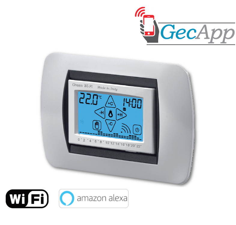 Green Wi-Fi è l'unico cronotermostato ad incasso in scatola 503, compatibile con la maggior parte delle placche in commercio, che può essere programmato ed installato tramite un'apposita APP compatibile sia con i sistemi Android sia con sistemi IOS. Alimentato a 230 Vca - 50 Hz, consente di avere sempre informazioni aggiornate sull'impianto di riscaldamento o condizionamento e di variarne lo stato e le impostazioni in modo semplice ed intuitivo.